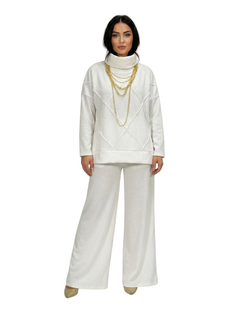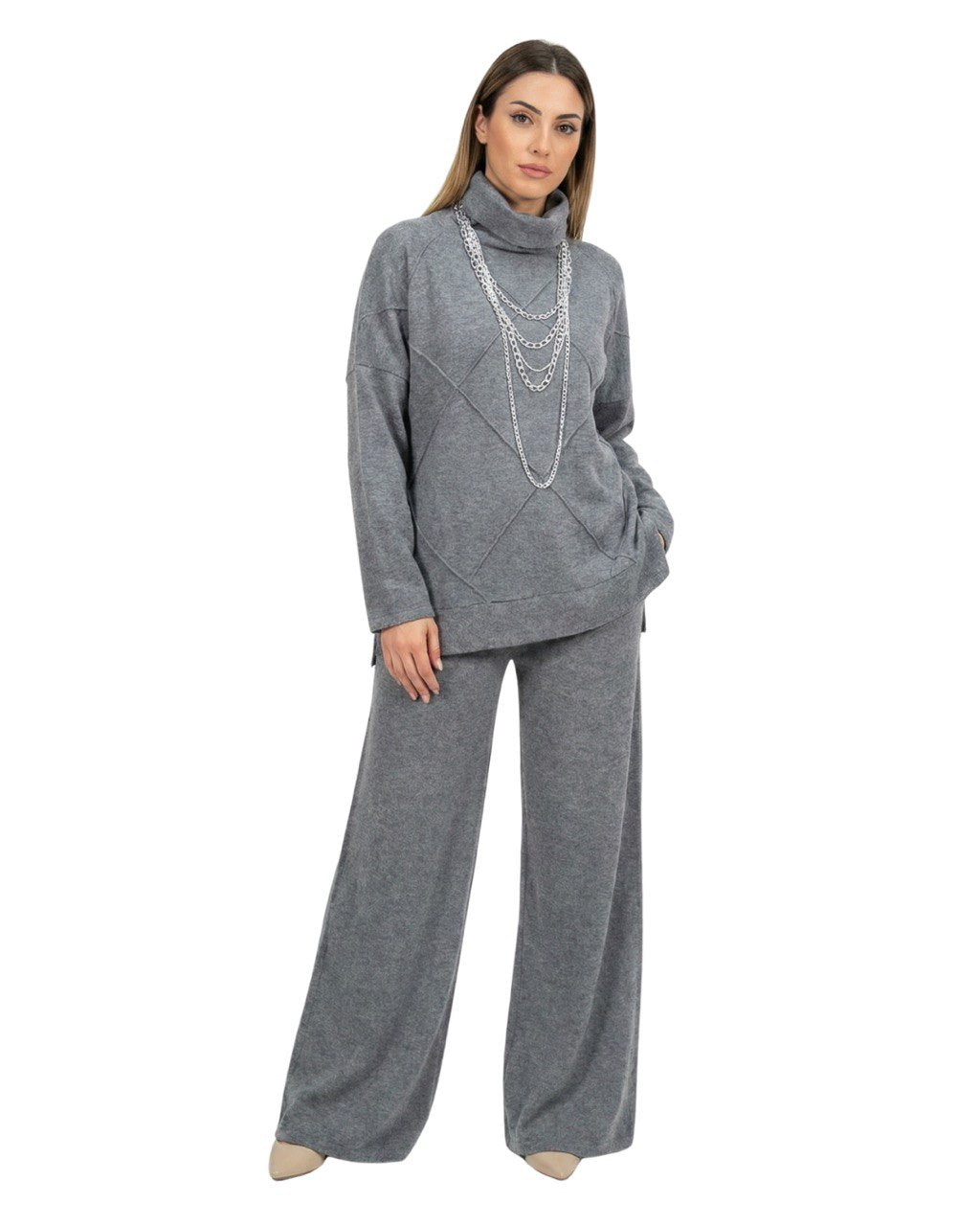 Completo in calda viscosa con fantasia geometrica tono su tono.