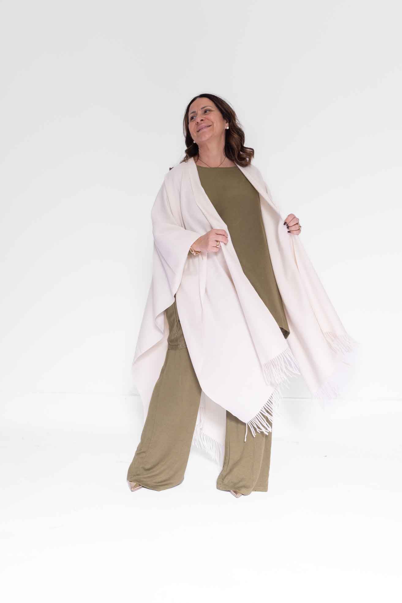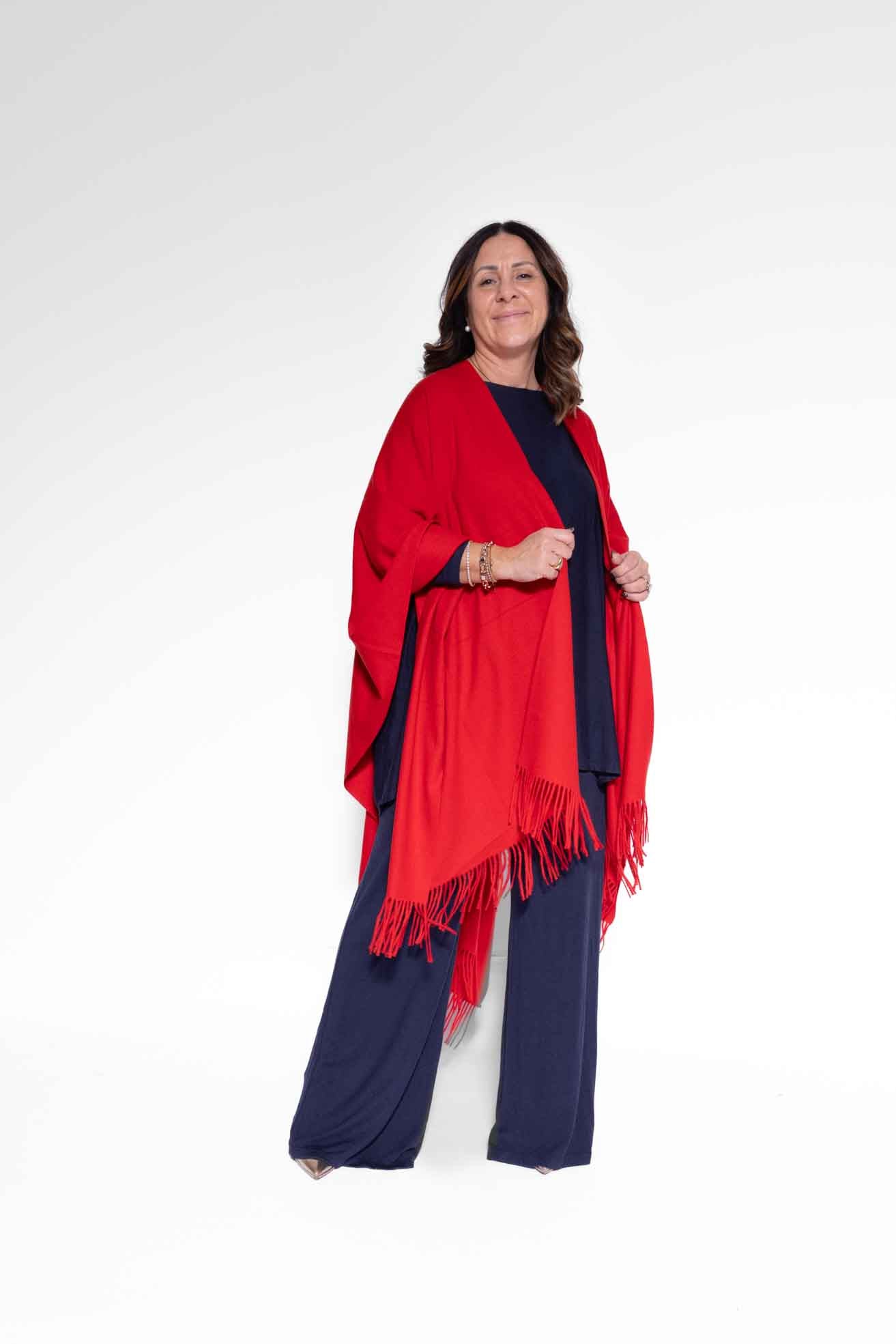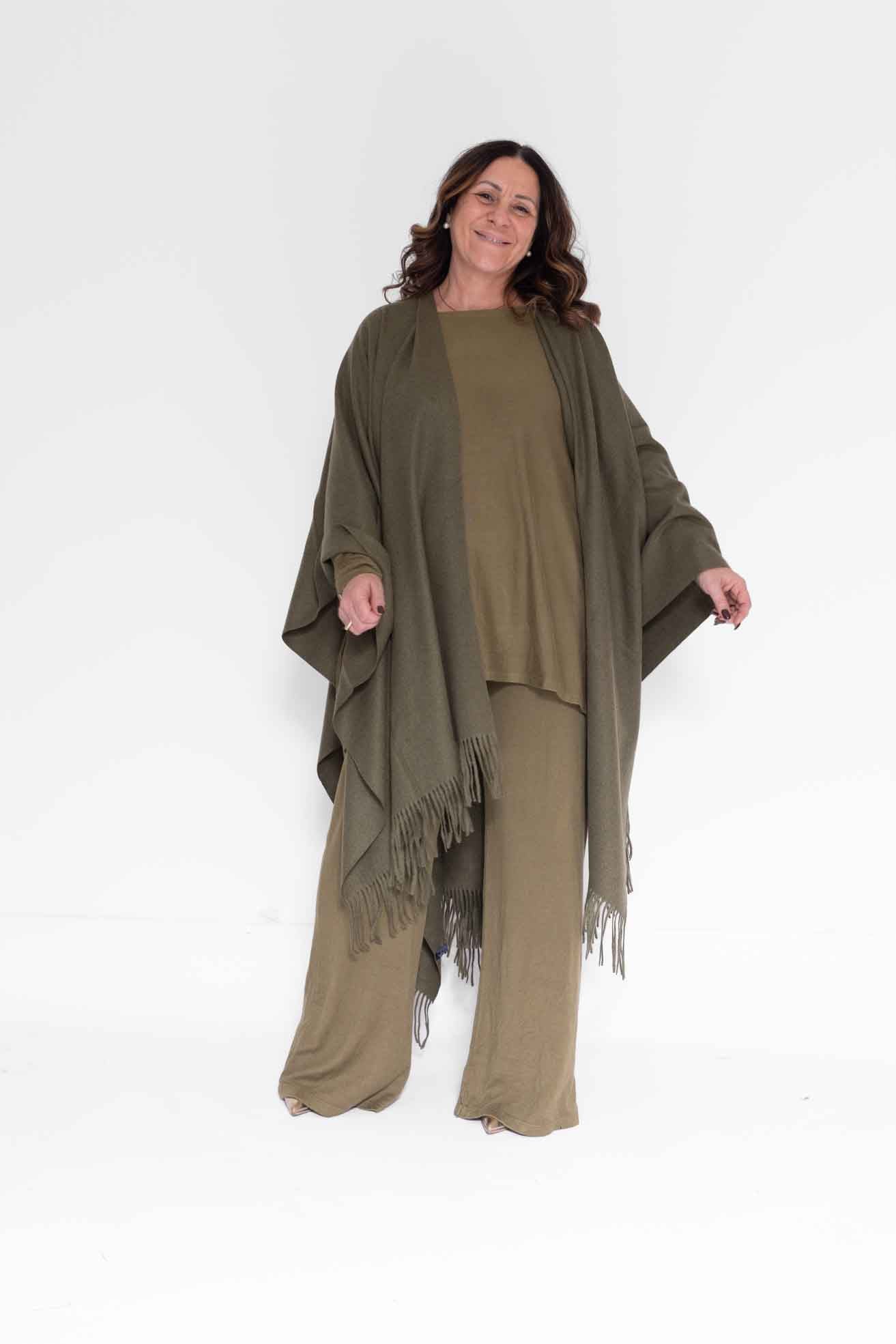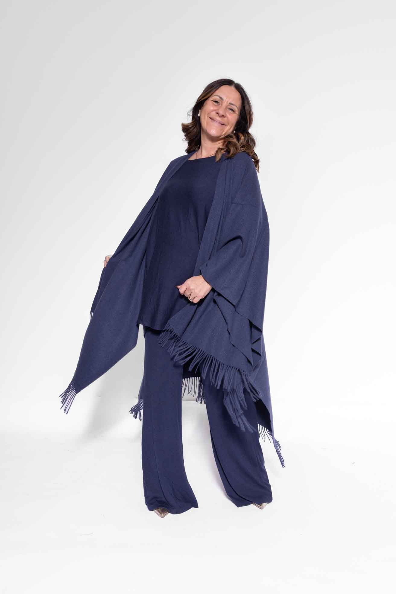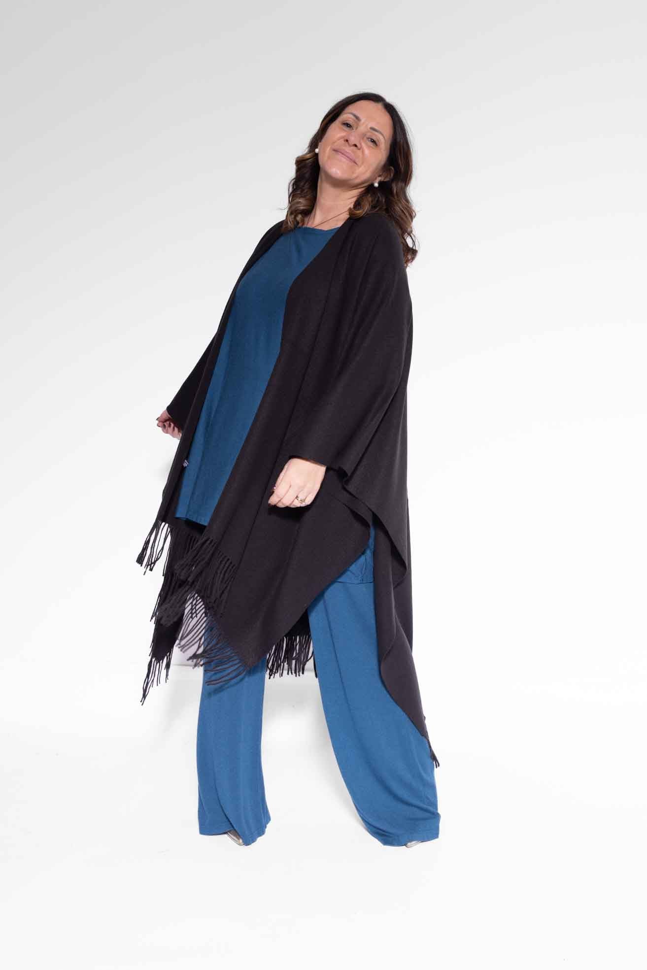 La mantella è avvolgente, realizzata con una texture calda e piacevole al tatto, scivola armoniosamente sopra qualsiasi outfit, ideale durante i mesi più freddi.
