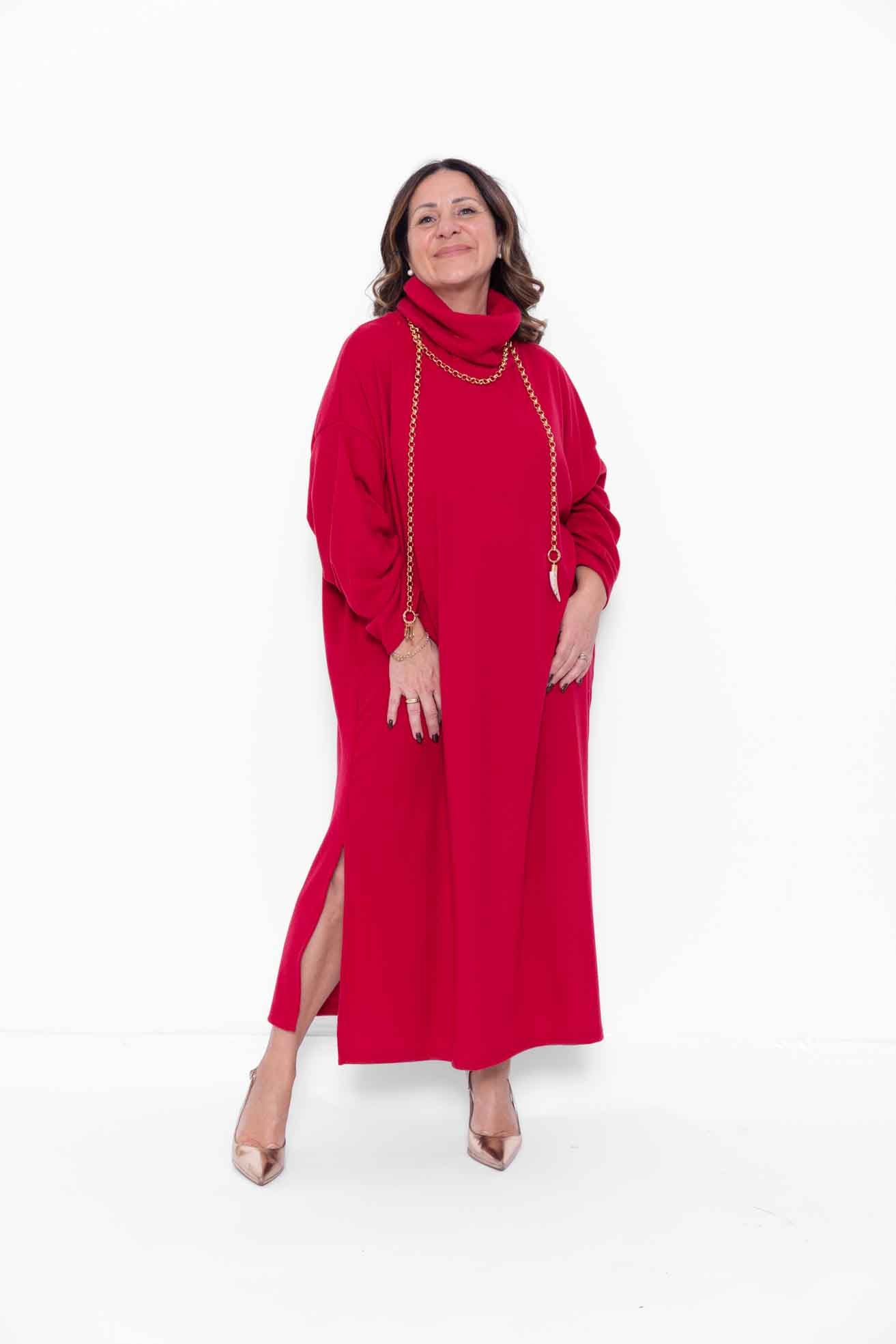 Its peculiarity is its beautiful soft cowl neck and side slits.