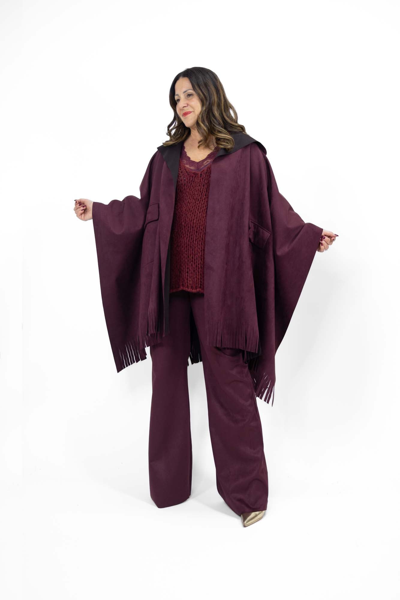 Completo Rebecca formato da mantella con pratico cappuccio e frange e pantalone dalla linea morbida.
