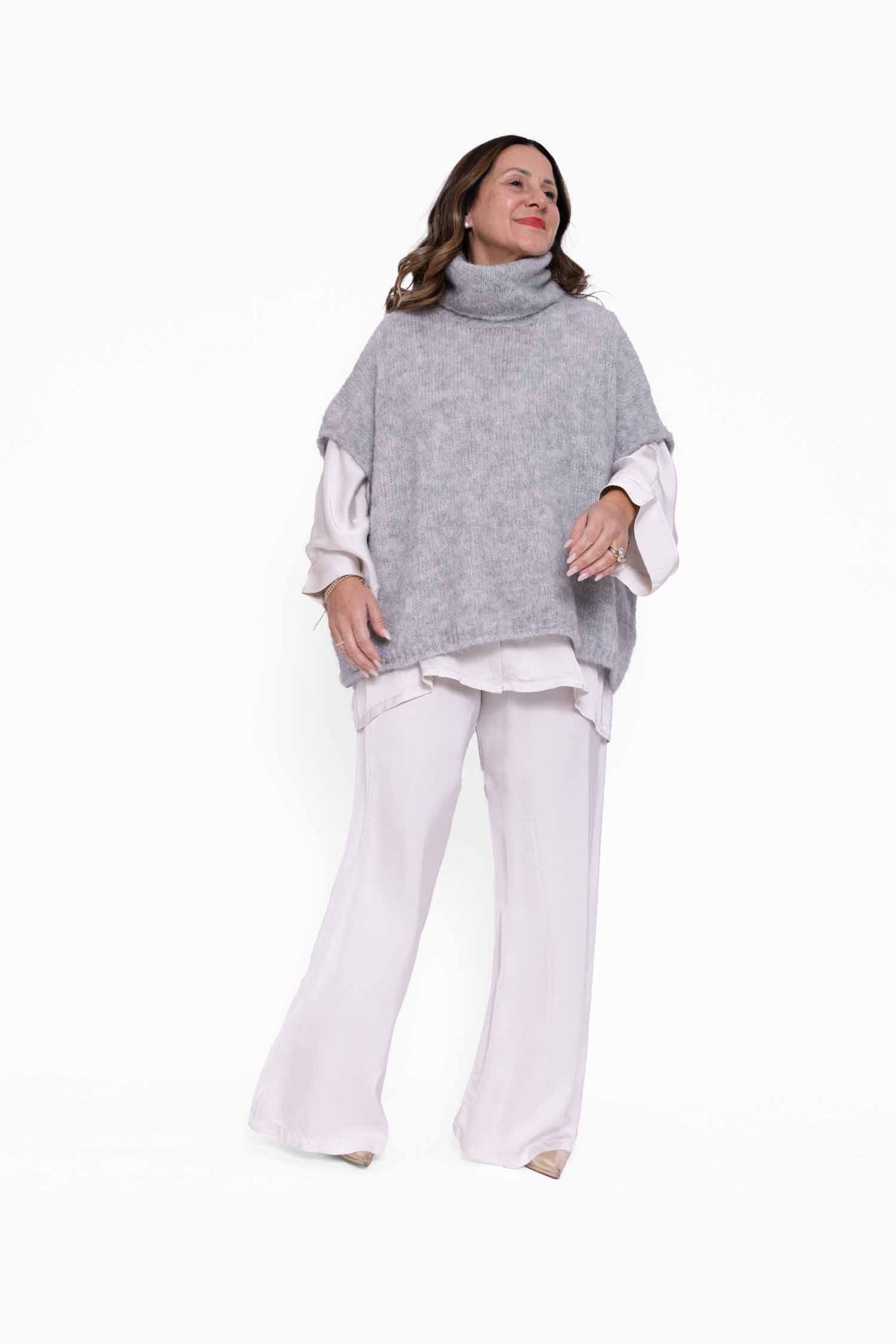 La maglia Tecla con la sua manica corta, il morbido colli dolcevita e la taglia unica, è il capo ideale per i primi freddi.